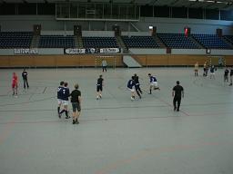 Barmbeker Jungs - Elblinge 1:1 Nachdem das erste Spiel souverän gewonnen worden war, war die Erwartungshaltung innerhalb der Mannschaft eventuell etwas zu hoch. Da wir am Anfang Poptown am stärksten eingeschätzt hatten, stellten wir uns die folgenden Spiele einfacher vor. Doch dies erwies sich als Trugschluss. Der folgende Gegner Barmbeker Jungs" war zäher als der erste. Früh gerieten wir durch einen blöden Ballverlust Höhe der Mittelinie und einer unsortierten Abwehr mit 0:1 in Rückstand. Doch wir ließen die Köpfe nicht hängen und versuchten mit aller Macht, den Ausgleich zu erzielen. Nachdem schon einige halbe" Torchancen nicht verwertet werden konnten, tauchte Benjamin plötzlich in halblinker Position vor dem gegnerischen Tor auf und konnte den Ball durch die Beine des Torwarts ins Tor befördern. In den letzten Minuten war das Spiel trotz Überzahl (Einer der Gegner kassierte eine 2-Minuten- Strafe) ausgeglichen. Wir konnten uns keine großen Chancen mehr erarbeiten, hier hätten wir auf Grund der Überzahl mutiger angreifen sollen. Deshalb ging das Unentschieden am Ende in Ordnung. | |