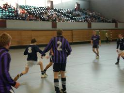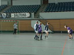 Barmbeker Jungs - Elblinge 1:1 Nachdem das erste Spiel souverän gewonnen worden war, war die Erwartungshaltung innerhalb der Mannschaft eventuell etwas zu hoch. Da wir am Anfang Poptown am stärksten eingeschätzt hatten, stellten wir uns die folgenden Spiele einfacher vor. Doch dies erwies sich als Trugschluss. Der folgende Gegner Barmbeker Jungs" war zäher als der erste. Früh gerieten wir durch einen blöden Ballverlust Höhe der Mittelinie und einer unsortierten Abwehr mit 0:1 in Rückstand. Doch wir ließen die Köpfe nicht hängen und versuchten mit aller Macht, den Ausgleich zu erzielen. Nachdem schon einige halbe" Torchancen nicht verwertet werden konnten, tauchte Benjamin plötzlich in halblinker Position vor dem gegnerischen Tor auf und konnte den Ball durch die Beine des Torwarts ins Tor befördern. In den letzten Minuten war das Spiel trotz Überzahl (Einer der Gegner kassierte eine 2-Minuten- Strafe) ausgeglichen. Wir konnten uns keine großen Chancen mehr erarbeiten, hier hätten wir auf Grund der Überzahl mutiger angreifen sollen. Deshalb ging das Unentschieden am Ende in Ordnung. | |