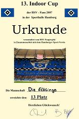 Am 22.12.2007 hatten die Elblinge ihren ersten öffentlichen Auftritt und zwar beim 13. Indoor-Cup der HSV-Fans". In der Alsterdorfer Sporthalle traten 33 Fanclubs gegeneinander an. Die Vorrunde wurde in sechs 5er- bzw. 6er-Gruppen gespielt, aus denen die ersten beiden der Gruppen und die besten vier Gruppendritten in das Achtelfinale einzogen. Wir hatten es mit den Teams Totale Offensive II", Rautenplaner", Teiland läuft nicht", Barmbeker Jungs" und Poptown HH I" in unserer Gruppe C zu tun. Das Team der Elblinge wurde von Nils Hartfelder(Nr. 4), Sebastian Bartels(Nr. 7), Martin Bochinski(Nr. 10), Tobias Goldenbaum(Nr. 1), Siyang Hu(Nr. 2) und Benjamin Böhme(Nr. 8) gebildet. Elblinge - Poptown HH I 1:0 Der erste Gegner war die erste Mannschaft von Poptown Hamburg. Ein großer Name unter den HSV-Fanclubs, da er einer der größten und bekanntesten ist. Angereist waren sie mit jeder Menge Fans und sämtlichen Fahnen, die man aus der Nordkurve kennt. Einschüchtern ließen wir uns davon aber nicht. In der zehnminütigen Spielzeit konnten wir den Gegner stark unter Druck setzen und uns einige Torchancen erarbeiten. Die einzige, die davon genutzt wurde, endete in einem schönen Tor von Martin Bochinski. Ein Heber von Benjamin Böhme über den herausstürzenden Torwart prallte nur an die Oberkante der Latte und Sebastian Bartels scheiterte wenig später an dem Torwart. In den letzten Minuten versuchte Poptown noch einmal mit aller Macht, den Ausgleich zu erzielen. Doch alle Angriffsbemühungen konnten durch unsere gut stehende Defensive um Nils Hartfelder unterbunden werden. Daher versuchte es Poptown mit einigen Distanzschüssen, die alle vom Keeper Tobias Goldenbaum gut pariert werden konnten. So konnten wir den Sieg und damit die ersten drei Punkte sichern. | |