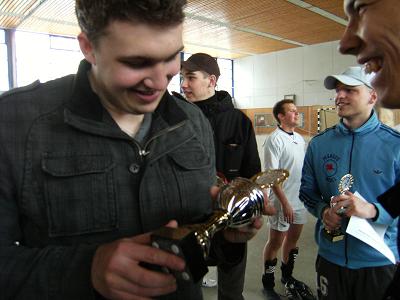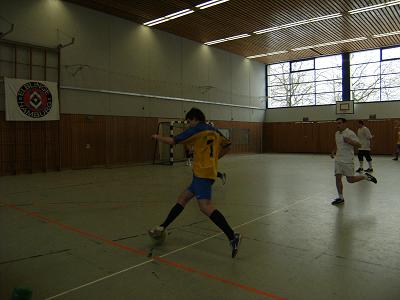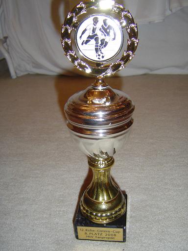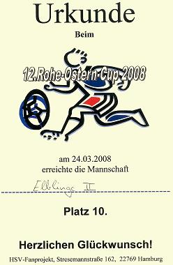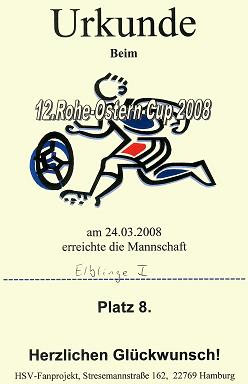 Am 24.03.2008 traten die Elblinge mit zwei Teams beim Rohe-Ostern-Cup 2008 an. Das Turnier fand in der Sporthalle Wegenkamp in Stellingen statt und insgesamt traten 19 Mannschaften an, wobei die Eblinge die einzigen mit zwei gemeldeten Mannschaften waren. Vom Indoor-Cup waren schon viele Teams und Gesichter bekannt, aber es waren für uns auch neue Namen dabei. Zum ersten Mal im Einsatz war auch die frisch angefertigte Elblinge Fahne, die an einem Holzgerüst in der Halle aufgehängt wurde. Außer einer kleinen ebenfalls aufgehängten Fahne von CFHH, war dies das einzige Banner in der Halle. Das Team Elblinge 1" wurde gebildet von René Billerbeck, Fabian Müller (Tor), Sebastian Bartels, Tobias Goldenbaum, Siyang Hu, Nils Hartfelder und erreichte den 8. Platz. Das Team Elblinge 2" bestand aus Martin Bochinski, Patrick Prager, Ann-Christin Müller, Jan Wulf (Tor), Simon Willhoeft und Tobias Bartels und erreichte den 10. Platz. Das Team 2 durfte gleich das erste Spiel in Gruppe A (und damit auch das erste Spiel des Turniers) spielen. In den sechs Minuten Spielzeit konnte das Team North Park Future" mit einer überlegenen Leistung 3:0 geschlagen werden. Dabei stach besonders Martin mit zwei Toren und einer Vorlage hervor. Da es einen Pokal für den besten Torjäger zu vergeben gab, weckte dies Hoffnungen, doch im weiteren Turnierverlauf sollte kein weiterer Treffer von Bochinski folgen. Das zweite Spiel verlor das Team 2 mit 1:0 gegen VFB Aus, Schluss und vorbei". Man hatte sich zwar einige gute Möglichkeiten erspielt, aber der letzte Pass kam meist zu ungenau oder gar nicht. Im dritten Spiel gegen Teiland" lag man zuerst mit 0:1 hinten, konnte aber kurz vor Schluss ausgleichen, was die Chance auf ein Weiterkommen ermöglichte. Doch im vierten Gruppenspiel kam man nicht über ein 0:0 gegen den späteren Gruppen Vierten Ulzburger Jungs" hinaus. So belegte man nur Platz drei in der Gruppe, was für die Endrunde leider nicht ausreichte. Die Berechnung ergab, dass dies insgesamt den zehnten Platz bedeutet. | |