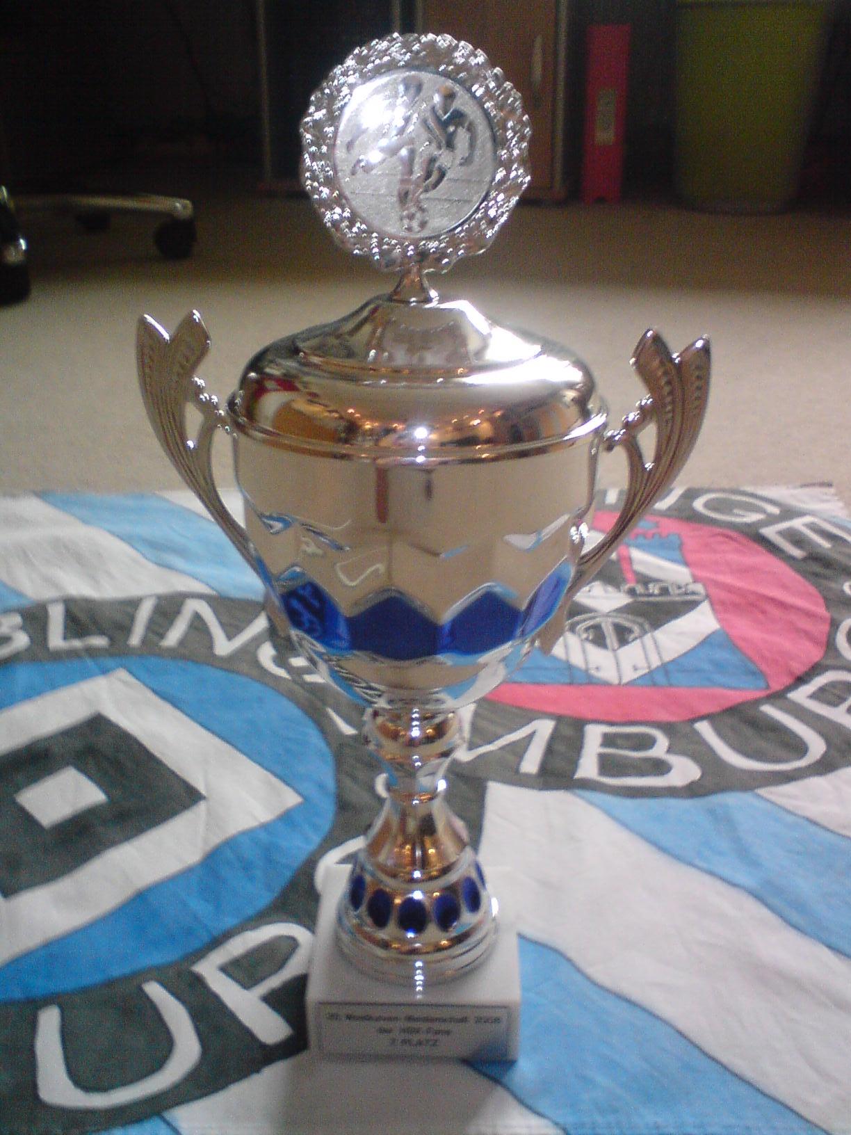 Am 31.05.2008 fanden die 20. Westkurvenmeisterschaften statt. Mit dabei waren 62 HSV-Fanclubs aus ganz Deutschland. Die WKM ist gleichzeitig die Qualifikation zur nationalen Fanclub-Meisterschaft. Die Elblinge traten zum ersten Mal in den neuen Trikots + Stutzen auf. Ein beeindruckendes Gesamtbild! Ein Spiel dauerte 10 Minuten, die Mannschaft bestand aus 6 Spielern. Leider hatten unsere kompletten Auswechselspieler kurzfristig abgesagt, so das wir das einzigste Team ohne Auswechler waren. Was die Mission Finale von Anfang an erschwerte. Nach einer langen Verzögerung zum Turnierstart hatten wir endlich unser erstes Gruppenspiel, gegen den 4. des letzten Jahres, "Die Bohnen". Dank eines Tores von Tobias Bartels gelang ein perfekter Turnierstart. Auch das zweite Spiel wurde 1:0 gewonnen. Diesmal war Fabian Müller der Torschütze. Jedoch musste Patrick Prager eine Zeitstrafe (2 Minuten) auf sich nehmen um den, frei auf das Tor zu laufenden, Stürmer festzuhalten. Im letzten Gruppenspiel, gegen die SG Dithmarschen/Nordfriesland, würde uns ein Unentschieden langen, um als Gruppenerster ins 16tl-Finale einzuziehen. Schnell geang Martin Bochinski der Fühhrungstreffer. Kurz vor Abpfiff musste unser guter Torwart Philip Idzikowski leider noch den Ausgleich hinnehmen. Dennoch zogen wir ungeschlagen in die nächste Runde ein. | |||||||||||||||||||||||||||||||||||||||||||||||||||||||||||||||||||||||||||||||||||